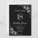 Une invitation à dîner en noir et blanc de 18e anniversaire avec des coins en dentelle ornés pour encadrer le texte blanc.