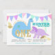 Polka dot brontosaurus et triceratops violets, adorable fête de premier anniversaire à thème dinosaure avec le drapeau pastel décoratif et des accents de couleur or. Invitation pour la première fête d'anniversaire du bébé avec de mignons dinosaures pour les garçons ou les filles.