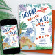 Dinosaur invitation anniversaire pour le 4ème anniversaire d'un garçon. Le texte rimant dit "Le rugissement [nom] fait quatre ans". Design de dino aquarelle avec de mignons dinosaures dans un cadre jurassique, jungle tropicale. Parcourez mon magasin pour plus d'invitations d'anniversaire de dinosaures.