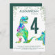 Un T-Rex rugit et un stegosaurus shuffent aux amoureux de Dino invitation pour une fête de 4 ans de dinosaures colorée et amusante. Personnalisez cette invitation à la fête de 4ème anniversaire Tyrannosaurus et stegosaurus Jurassic jungle avec le nom du garçon ou de la fille d'anniversaire, le numéro de l'anniversaire et les détails de la fête dans la typographie verte moderne et vous êtes tous prêts pour un anniversaire de dinosaure bondée amusant thème dino anniversaire. Toutes les espèces de dinosaures sont les bienvenues. Dinosaure, oeuvre originale de l'artiste Catherine Sweetman