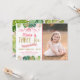 Cette adorable invitation à l'anniversaire présente des feuilles d'aquarelle tropicale ornés d'ornements de feuilles de parties scintillant dorées et de dinosaures roses.