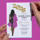 African American Graduation Party Invitation femme portrait dessin robe noire, casquette rose et robe, cheveux longs foncés. classe de ballons d'or 2024.