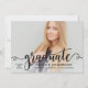 La carte de faire-part élégante et élégante de remise de diplômes et l'invitation de la fête comportent une photo de haut niveau avec une superposition de script "diplômé". Personnalisez le texte personnalisé moderne avec le nom de votre élève, l'école et l'année de classe. Cette carte recto verso comprend le libellé de l'invitation de la partie de graduation au verso. On peut customiser le joli jeu de couleurs rose et noir pour les coordonner avec les couleurs de la photo ou de la fête.