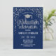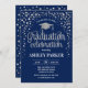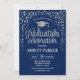 Invitation à la fête de fin d'études pour hommes ou femmes. Elégante carte invitation en bleu marine et argent. Design simple et moderne avec des confettis de parties scintillant, un casquette et des scripts de typographie. Idéal pour une célébration élégante de remise des diplômes.