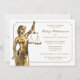 Invitation de fête de remise des diplômes d'école de droit. Madame Justice avec la feuille d'or de faux. Élégant, chic avec l'arrière - plan de tableau.