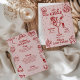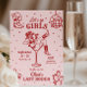 Cette invitation et cet itinéraire de week-end de bachelorette rose et rouge présentent un thème audacieux et rétro de "dernier rodéo" western avec des illustrations ludiques de style doodle, parfait pour célébrer dans le vrai style cowgirl n'importe où. La couverture met en vedette une cowgirl confiante allongée dans un verre à martini, entourée de doodles fantaisistes de bottes de cowboy, de chapeaux, de boules disco, de cactus et d'étoiles, mêlant le charme rustique de l'Ouest à des vibrations de fête animées. Le verso affiche un itinéraire complet de week-end encadré par des icônes de doodle coordonnées comme des lassos, des bottes, des cocktails et des fers à cheval pour un look amusant et cohérent. Avec sa palette de couleurs vibrantes, ses détails dessinés à la main et son design recto-verso assort