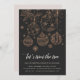 Des amis Invitations vous aideront à décorer votre arbre sur des piqûres et des cocktails avec nos invitations à la fête de coupe de sapin de Noël avec des ornements en feuille d'or faux rose et des flocons de neige sur un arrière - plan gris charbon profond. Personnalisez avec les détails de votre fête en dessous.