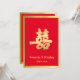 Spécialement conçue pour un mariage chinois, cette carte porte le symbole "Double Bonheur" en calligraphie, "Double Bonheur" orthographié xi ou "Hsi" en mandarin et prononçant "Shuang-xi" est un personnage chinois bien connu, utilisé traditionnellement en mariage chinois comme symbole d'amour, de bonheur et de chance pour le couple marié. L'utilisation de la couleur rouge est une couleur qui est tout aussi bien une couleur populaire dans la culture chinoise, qui symbolise la chance, le bonheur et la joie. Alors que la couleur de l'or symbolise la richesse et la prospérité.