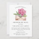Elégant baby shower fleuri rose vintage ou douche nuptiale par carte modèle d'invitation postale. Envoyez cette carte aux invités qui ne peuvent pas assister à la fête à cause de la distance, etc. Elle contient des informations d'enregistrement et un message sucré incitant les amis et la famille à envoyer des cadeaux et de l'amour par la poste. La carte présente l'illustration d'une enveloppe vintage avec une fleur de pivoine rose et des feuilles d'eucalyptus en ressortant.