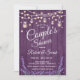 Invitation à la douche de couple - Lavande violet bois rustique. Design de style campagnard avec bois violet foncé, lumières à cordes féériques, jarres de maçon et fleurs de lavande.