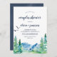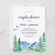 Cette invitation à la douche pour couples de Rocky Mountain est parfaite pour un wedding shower extérieur. Le design comprend un paysage sauvage peint en bleu et vert avec des pins d'aquarelle, des oiseaux et des montagnes.