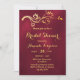 Une carte d'invitation branchée et moderne à la douche nuptiale. Arrière - plan de couleur bordeaux, avec des faux caractères dorés. La couleur bordeaux est inégale, comme une peinture à la citron sur un mur. Texte : Fête des mariées. Modèles pour vos informations. Décoré avec des tourbillons fleuris en faux or