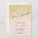 Une typographie moderne, une douche à parties scintillant faux or assez chic et élégante à l’ombre avec une couleur pastel blush rose bloc de couleur bridal invitation de la partie de douche.