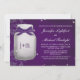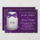 Un pot de maçon hued magnifique de luciole de pourpre et de prune couple l'invitation de wedding shower qui les ressembler à lui rougeoie. Ajoutez les initiales et ou le monogramme des jeunes mariés au pot avec une conception mauve-foncé et par blanc imprimée de regard de ruban. Une frontière vintage subtile de dentelle d'antiquité de damassé complimente cette conception rustique pourtant élégante avec les lucioles enchanteresses intérieures et extérieures du pot. Ces invitations sont beaux pour une nuit, une basse-cour, une douche orientée de ferme ou de pays ou une partie de fiançailles. © Chrissy H. Studios, LLC d'illustration. Tous droits réservés.