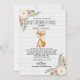 Une invitation baby shower illustrant l'illustration d'un renard portant une couronne de fleurs. Poème personnalisé. Personnalisez le texte. L'Arrière - plan est décoré dans un style en bois gris clair.