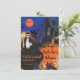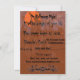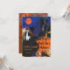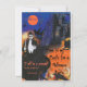Dracula dans une longue cape noire et un gilet blanc portant des chandeliers lumineux dessin avec pleine lune orange avec château en arrière - plan et ciel bleu foncé invitation costume d'Halloween. Chat noir et corbeaux et texte noir et orange. Retour est pour vos informations de fête. Oeuvre de PatriciaVilla.