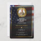 Photo personnelle décorée de feuilles de laurier dorées et d'un cadre doré sur un glorieux drapeau américain flottant sur un fond noir. Un modèle d'invitation à une fête de retraite élégant avec photo facile à éditer. Ce design luxueux convient aux vétérans, aux militaires, aux emplois liés au gouvernement, à la police ou aux emplois liés au patriotisme.