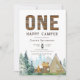 Cette amusante invitation rustique a un lambris "ONE" et un joyeux camper. Le fond a une forêt aquarelle, des montagnes et des paysages. Il est terminé par les articles de camping bronzés, verts et bruns qui comprennent une tente et une cheminée. Le dos a un motif de la même tente aquarelle.