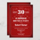 30e invitation à fêtes d'anniversaire surprise pour hommes ou femmes. Elégant rouge rétro, design blanc avec police de script de typographie. Bravo à 30 ans ! Peut être customisé à n'importe quel âge.