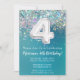 4th Birthday Invitation Turquoise et Parties scintillant d'argent 4th anniversaire invitation pour un enfant de 4 ans avec écriture de script moderne et ballons de papier amusant.