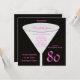 Cette invitation à la fête du 80e anniversaire a été faite pour les femmes car elle présente les couleurs noir et rose chaud. Un verre est le point focal avec le nom de l'anniversaire honoré et les détails de la fête d'anniversaire à l'intérieur. Le chiffre 80 apparaît en bas à droite en rose chaud. Cette invitation de fête de 80e anniversaire est un design très moderne pour elle. Copyright henishouseo