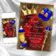 Petit prince royal invitation baby shower avec de mignons objets princiers royaux bleu et or sur un bel arrière - plan rouge et or. Cette invitation au baby shower royal du prince est facilement personnalisée avec vos détails d'événement.