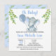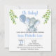Invitation au Baby shower d'aquarelle de fille Cette invitation au baby shower d'éléphant d'aquarelle de fille présente un joli éléphant avec un peu de feuillage vert sur un arrière - plan blanc. Idéal pour un baby shower à thème féminin à venir.