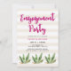 Cette invitation élégante et amusante à la fête de fiançailles mariages présente des illustrations de cactus, avec de la fausse typographie rose foncé sur un arrière - plan rayé neutre, pour un look désert glamour. Art rayé de Indie Grace Designs.