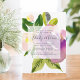 L'élégante et moderne invitation à la fête florale présente un bouquet de fleurs d'aquarelle violette prune et rose vif, agrémentées de bourgeons et d'une végétation luxuriante. Les détails de votre fiançailles sont superposés sur un élément blanc pur dans un élégant lettrage noir foncé accentué de calligraphie de style manuscrit.