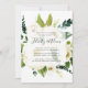Une invitation à la fête florale élégante et moderne présente un arrière - plan de roses d'ivoire et de pivoines aux plantes vertes luxuriantes et au feuillage. Les détails de votre fiançailles sont superposés sur un élément blanc pur dans un élégant lettrage noir foncé accentué de calligraphie de style manuscrit.