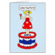Une femme de bande dessinée debout sur un gâteau géant blanc, rouge et bleu. La femme tient un cocktail et dit "Fête du Travail !" L'image est placée contre un arrière - plan de couleur rose pâle.