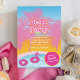 Une invitation à la fête de la bachelorette rose amusante avec des palmiers aux couleurs vives, une piscine, des fleurs de flamants et de beignes. Ajoutez le nom de la bachelorette dans le cercle rose en bas.