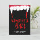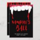 Une invitation pour une fête d'Halloween de Vampire. Ce dessin est composé d'un dessin simple de crocs de vampires effrayants avec du sang qui s'écoule d'eux sur un arrière - plan noir. Sur le devant, il est écrit "Bal de Vampire" en rouge vif dans une police dessinée à la main et conçue pour ressembler à du sang coulant des crocs. Ci-dessous, il y a de la place pour que vous remplissiez quelques détails de votre événement dans une police blanche moderne. A l'arrière, le style est le même avec une simple bordure de goutte de sang sur le dessus et beaucoup d'espace pour vos détails dans une police blanche moderne sur un arrière - plan noir.