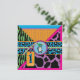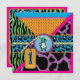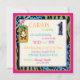 Impressions de Safari, girafe, zèbre, guépard et motif à pois de polka, avec singe accroché sur une vigne et des étiquettes d'apparence 3D, arcs, trimes une carte d'invitation de premier anniversaire.