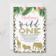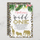 Ce dessin sucré présente trois animaux et mot de safari en parties scintillant d'or imitation. Un motif en peau de léopard ou de guépard et quelques feuillages et fleurs tropicaux sont également inclus dans le design. Ce design est une façon mignonne d'invitation les invités à un premier anniversaire et idéal pour tous ceux qui aiment les motifs léopard de peau.
