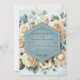 A delicate floral design featuring creamy roses intertwined with soft green foliage. The artwork evokes a romantic and classic mood, centered around a muted blue palette with warm floral accents.