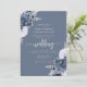 Cette élégante invitation à un mariage présente des bouquets de fleurs bleues poussiéreuses, agrémentés d'une végétation en faux feuille d'argent dans deux coins, sur un arrière - plan bleu poussiéreux. Le texte personnalisable combine des polices sérif gris argenté, italique et écriture manuscrite. Le design floral bleu et argent poussiéreux est répété à l'envers.