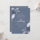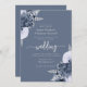 Cette élégante invitation à un mariage présente des bouquets de fleurs bleues poussiéreuses, agrémentés d'une végétation en faux feuille d'argent dans deux coins, sur un arrière - plan bleu poussiéreux. Le texte personnalisable combine des polices sérif gris argenté, italique et écriture manuscrite. L'envers offre de l'espace pour les détails mariages sur un arrière - plan bleu poussiéreux solide, ainsi qu'un code QR que les invités peuvent scanner pour visiter votre site Web et RSVP, qui économise le coût d'impression et d'envoi de cartes RSVP séparées.