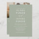 Cette faire-part de mariage verte à la sauge poussiéreuse allie à merveille simplicité moderne et élégance organique. Le ton vert tamisé crée un look doux et apaisant qui semble naturel mais sophistiqué — idéal pour les couples qui veulent que leurs invitations se sentent intemporelles et sereines. Le design comprend votre photo de couple personnelle pour une touche chaleureuse et personnelle, et comprend un code QR intégré afin que les clients puissent facilement RSVP ou visiter votre site Web mariage. Une typographie propre et élégante et un agencement minimaliste rendent cette invitation à la fois élégante et fonctionnelle. Imprimé sur des cartons de qualité supérieure, ce design s'associe magnifiquement aux accents d'ivoire, de beige ou d'or — parfait pour les mariages de jardin, les cérémonies en plein air ou les célébrations romantiques modernes qui embrassent des tons subtils et terreux.