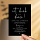 Announce your happily ever after in style with our modern minimalist casual script design wedding reception elopement dinner celebration invitation card in black and white theme. Our Happily Ever After "eat, drink and dance!" Invitation card is ideal for couples who have decided to elope and want to host a party to celebrate their union. With its sophisticated yet playful design, this invitation is sure to set the tone for an unforgettable event. The invitation card features a minimalist design with a black and white scheme, adding a touch of timeless elegance to your celebration.