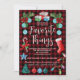Invitation vos amis et votre famille pour une fête d'échange de cadeaux de Noël "Favorite Things" avec cette invitation plaid rouge avec des illustrations de billes, lumières, étoiles, bas, cadeaux, sucres de canne et branches festives. Modèle entièrement modifiable avec les détails de l'événement, les noms d'hébergement et les informations rsvp.