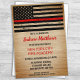 Célébrez votre diplôme et amis invitations et votre famille à votre fête de graduation de pompier avec ce bois rustique Mince Red Line Firefighter Graduation Invitation - Etats-Unis Drapeau américain design en Fireman Drapeaux couleurs, dessin en détresse . Personnalisez avec le nom, l'académie de feu, le lieu d'adresse et les détails rsvp. Cette invitation de graduation de l'académie d'incendie peut être utilisée pour la retraite des pompiers, il suffit de changer le texte lors de la personnalisation. Consultez notre collection pour obtenir des cadeaux de remise de diplômes de pompiers, des faveurs de fête et des fournitures. DROIT D'AUTEUR © 2020 Judy Burrows, Black Dog Art - Tous droits réservés. École des pompiers Diplôme de pompier mince Red Line Invitation