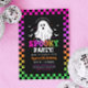 🖤 🩷 Invitations vos goules et vos fantômes dans le style avec cette Invitation d'anniversaire de Neon Ghost Halloween ! Plein de charme éffrayant rétro, ce design présente un arc-en-ciel à damiers frontière, un fantôme super et des chauves-souris déplaisantes-mignonnes qui donnent l'ambiance parfaite à la fête. Avec son mélange de couleurs arc-en-ciel — du rose pâle au vert émerveillé — cette imprimante est parfaite pour un bain d'anniversaire effrayant et amusant. Commandez des impressions ou partagez numériquement pour un bon moment !