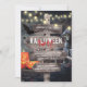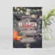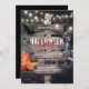 Invitations éffrayantes à la fête d'halloween avec une maison hantée, citrouilles, araignées, chauves-souris, la faucheuse, des lampes à cordes, et un panneau rustique en bois avec l'information de la fête sur.