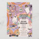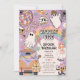 Retro Éffrayant Un Halloween 1er Anniversaire Invitation de fête - Soyons Super ! Le design comprend un arrière - plan coloré avec un arc-en-ciel boho. Des illustrations cool rétro décorent le modèle simple avec d'adorables fantômes hippies, des fleurs de crâne, une boule de disco éffrayante et des bonbons spooktaculaires.