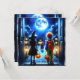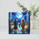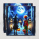 Des invitations effrayantes à la fête d'Halloween. Deux enfants en costume de clown et costume de sorcière regardant par leur porte d'entrée un monstre effrayant les regardant. Entrez si vous osez !