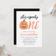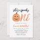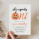 Belle invitation à la fête d'anniversaire sur le thème de l'Halloween avec l'expression "Il/Elle est un Éffrayant" dans un script manuscrit avec un jack-o-lanterne d'aquarelle. Personnalisez les invitations éffrayantes à la fête du 1er anniversaire avec les détails de votre fête ci-dessous.