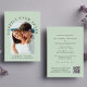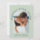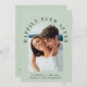 Faire-part de mariage tout-en-un vert sauge moderne avec votre photo dans un cadre voûté, "Happily Ever After" en typographie élégante et vos prénoms, date et emplacement mariage. Au contraire, personnalisez votre invitation en utilisant une simple typographie et entrez l'adresse de votre site Web mariage pour créer un code QR numérisable pour que vos invités puissent scanner en ligne vers RSVP et obtenir des détails mariages supplémentaires tels que des hébergements.