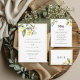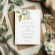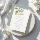 Ce magnifique faire-part de mariage d'inspiration méditerranéenne présente des citrons aquarelles à la verdure élégante et de délicates fleurs de jasmin à la bordure jaune pastel. Vert sauge classique sur le dos. Un choix élégant pour un mariage extérieur, nature ou destination.