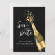 An elegant black and gold Save the Date design featuring a popping champagne bottle, symbolizing celebration and timeless romance. The dark background paired with golden accents creates a luxurious, modern wedding aesthetic perfect for formal, evening, or upscale city weddings. Ideal for couples seeking a classy yet bold announcement that sets the tone for a chic and memorable wedding celebration.